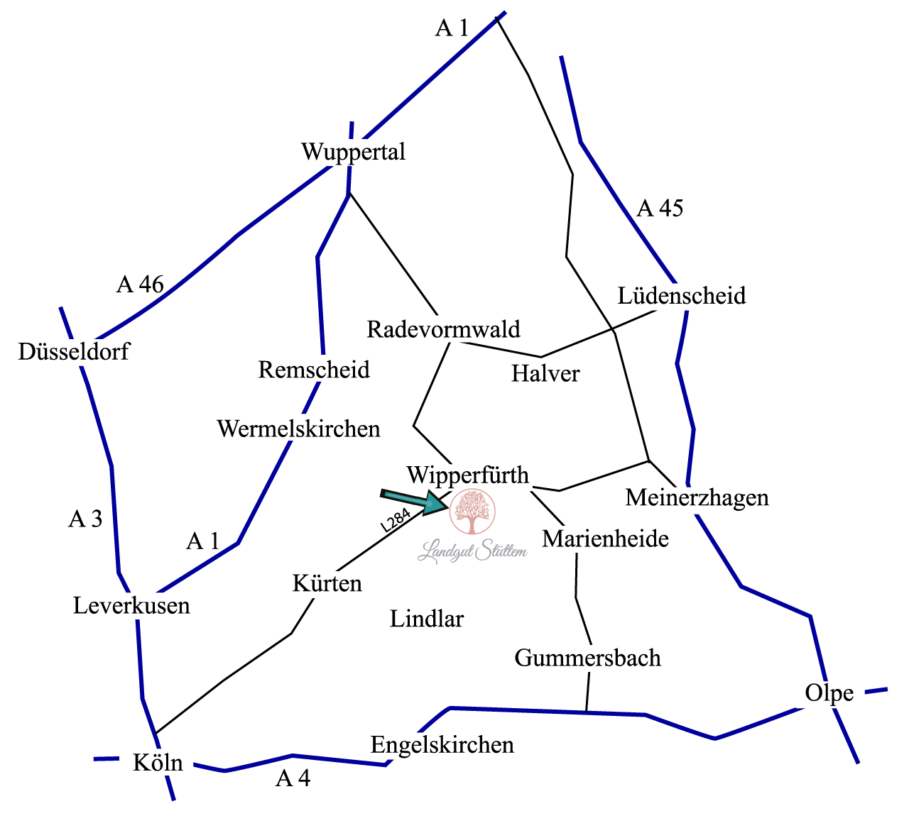 In den Hügeln des bergischen Landes, umgeben von Wiesen und Wäldern, liegt das Landgut Stüttem. Im Park des Landgutes wird die freie Trauung stattfinden und im Innenbereich wird gefeiert und gegessen. So findet Ihr dort hin: